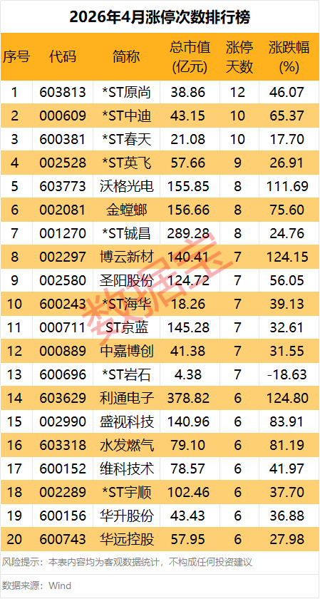 涨停方面,*ST原尚、*ST中迪、*ST春天、*ST英飞排名前四,月涨停次数依次为12次、10次、10次、9次。非ST股中,沃格光电、金螳螂斩获8次涨停,博云新材、圣阳股份、中嘉博创则均收获7次涨停。