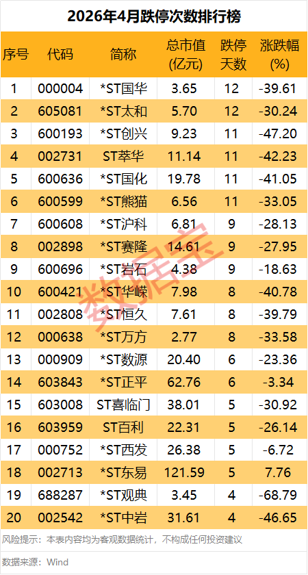 跌停方面,*ST国华、*ST太和、*ST创兴、ST萃华、*ST国化、*ST熊猫排名靠前,月跌停次数均在10次以上。