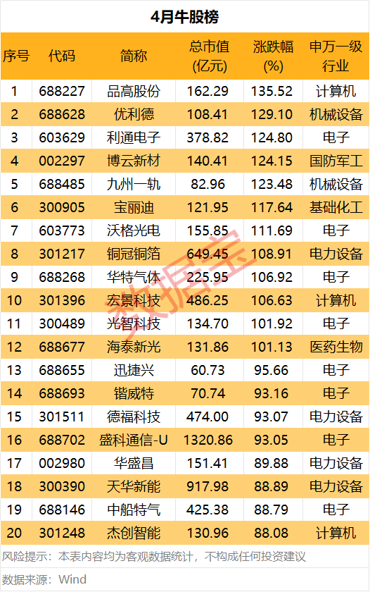 牛股方面,2026年4月,A股市场共计12股股价涨幅超100%。品高股份、优利德、利通电子、博云新材、九州一轨涨幅靠前,均在120%以上。品高股份居首,股价大涨135.52%。