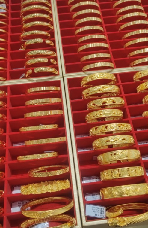 “金包银”饰品,外表上与足金手镯并无差别。(吴家明/摄)