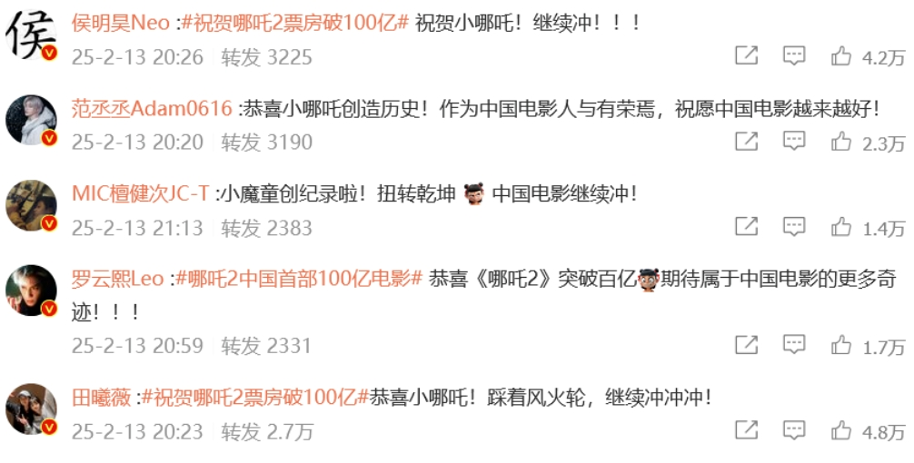 此外,还有胡海泉、王铮亮、林依轮、金晨、范丞丞、侯明昊、檀健次、罗云熙、田曦薇、丁禹兮、张凌赫、白鹿、孟子义、罗一舟、李一桐等多位明星发文祝贺《哪吒2》。