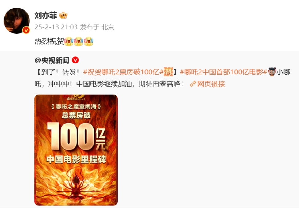 贾玲、刘亦菲、张雨绮等数十位艺人发文祝贺《哪吒2》