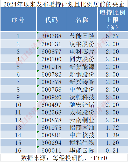 记者梳理iFinD数据发现,2024年以来截至2月14日,新发布增持公告的央国企上市公司中,被控股股东或实际控制人增持比例上限居前的央国企有节能国祯、凌钢股份、电科芯片、同方股份、新集能源等公司。