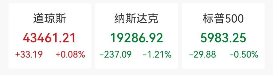 截至收盘,标普500指数跌0.5%,报5983.25点;纳斯达克综合指数跌1.21%,报19286.92点;道琼斯工业平均指数涨0.08%,报43461.21点。