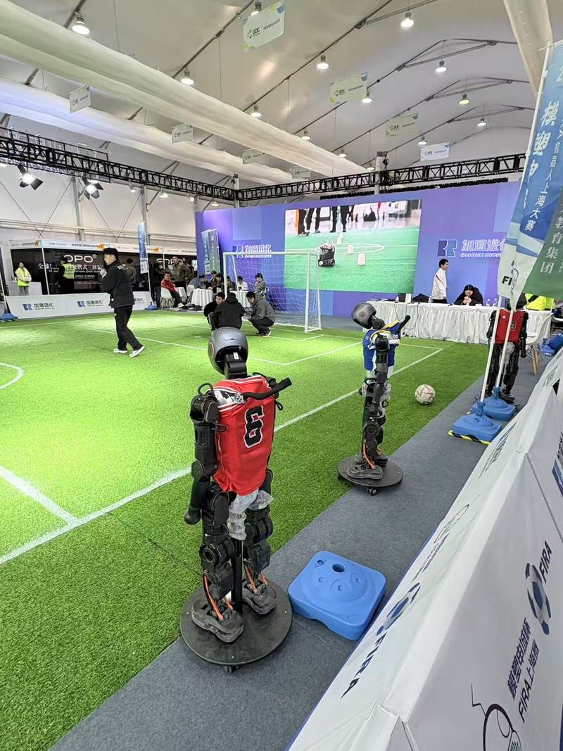 工作人员介绍称:“让机器人踢足球,做奔跑、传球、射门等动作,不仅对机器人的智能化程度提出了相当高的要求,还要求机器人具备足够强的泛化理解能力,有较强的平衡能力和灵巧性,以适应不同场景并做出准确判断。”