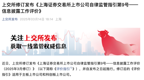 3月14日,沪深交易所发布修订后的信息披露工作评价指引(以下简称指引)。该指引自发布之日起施行。