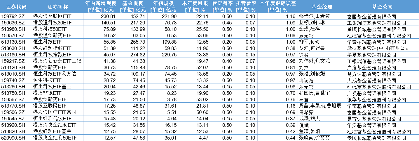 无论从整体规模上来看,还是从新增规模来看,富国基金的港股通互联网ETF无疑都是今年最吸金的ETF。此外,年内新增规模较大的港股ETF均为互联网科技类,吸金能力甚至超过了年内涨幅更好的港股创新药类ETF。