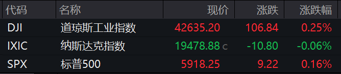 当地时间周三,美国三大股指收盘涨跌不一,道指涨0.25%,标普500指数涨0.16%,纳指跌0.06%。