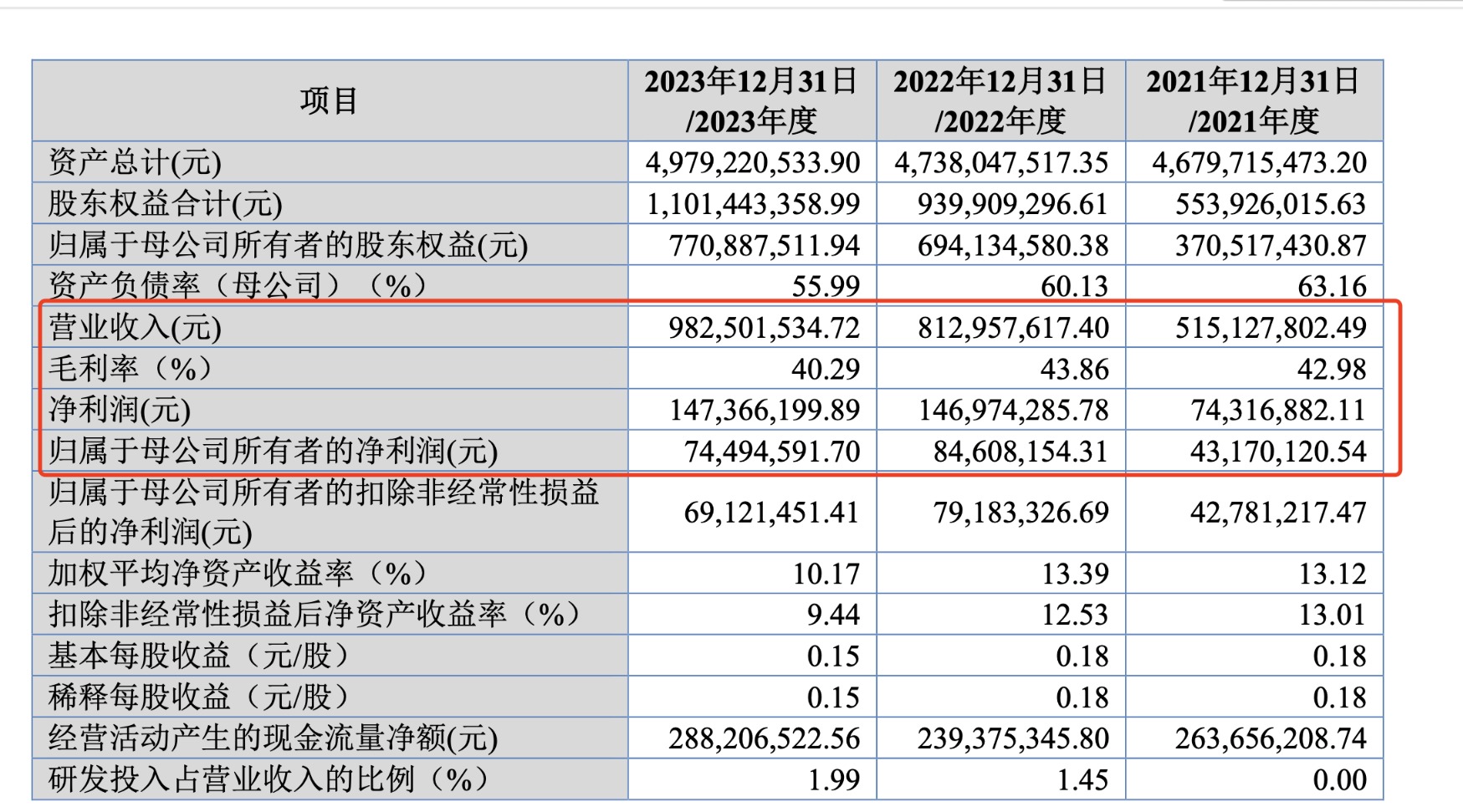 报告期内,公司实现营业收入分别为5.15亿元、8.13亿元和9.83亿元,实现归母净利润分别为4317.01万元、8460.82万元和7449.46万元。