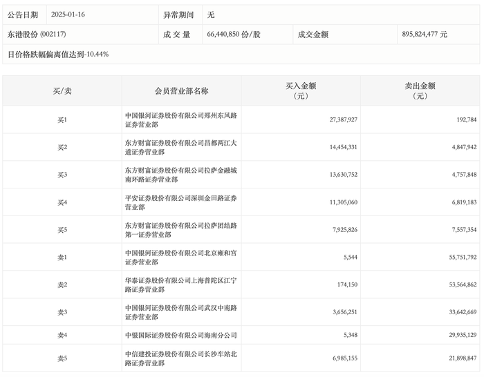 1月16日,东港股份今日跌停,龙虎榜数据显示,上榜营业部席位全天成交3.04亿元,占当日总成交金额比例为33.99%。其中,买入金额为8553.03万元,卖出金额为2.19亿元,合计净卖出1.33亿元。