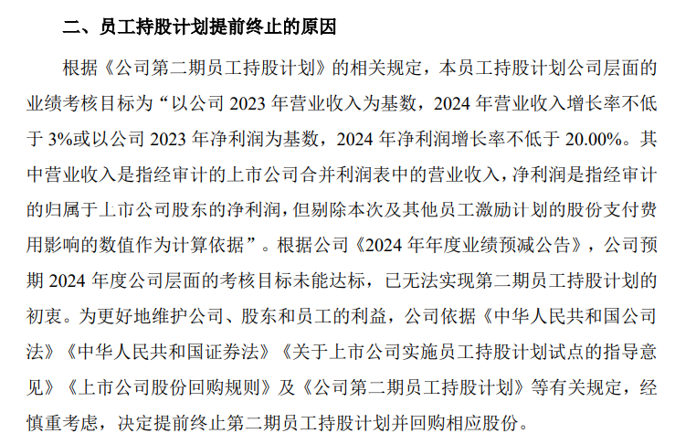 公告显示,根据公司《2024年年度业绩预减公告》,公司预期2024年度公司层面的考核目标未能达标,已无法实现第二期员工持股计划的初衷。为更好地维护公司、股东和员工的利益,公司依据有关规定,经慎重考虑,决定提前终止第二期员工持股计划并回购相应股份。