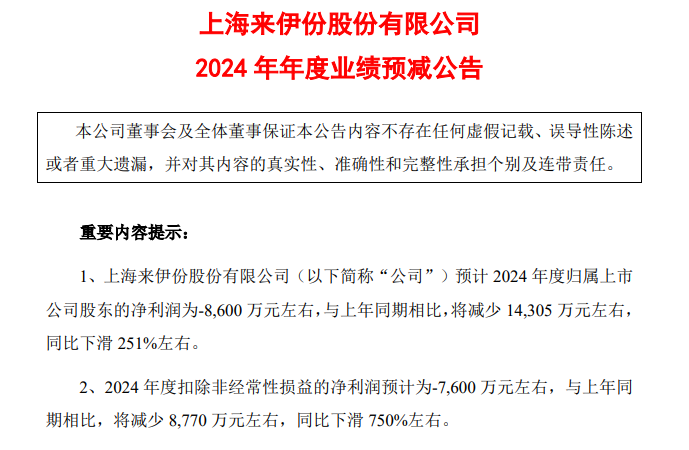 1月16日,来伊份发布了2024年年度业绩预减公告,来伊份预计2024年度归属上市公司股东的净利润为-8600万元左右,与上年同期相比,将减少1.43亿元左右,同比下滑251%左右。扣除非经常性损益的净利润预计为-7600万元左右,与上年同期相比,将减少8770万元左右,同比下滑750%左右。