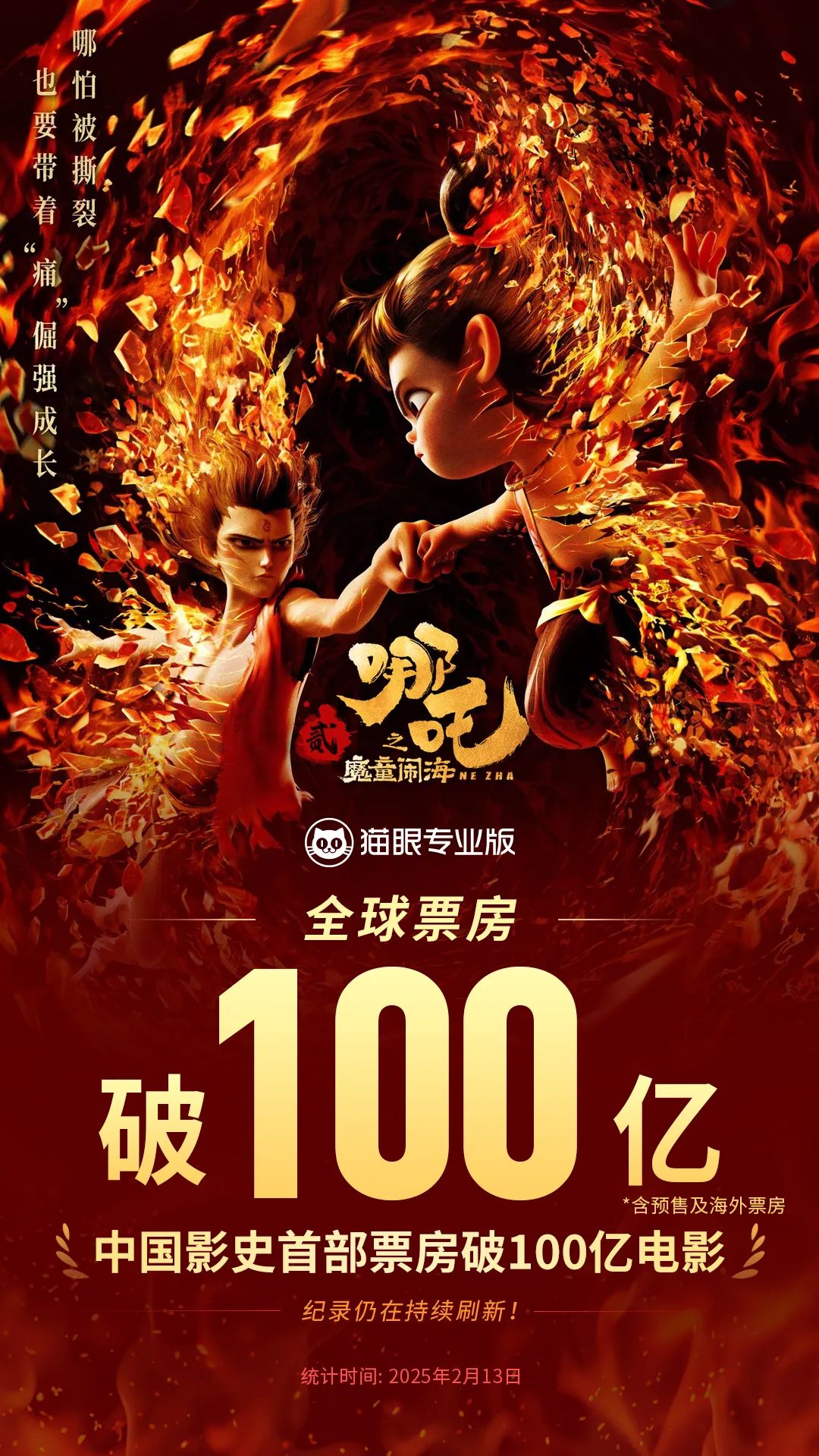 猫眼专业版App数据显示,截至2月13日19时11分,电影《哪吒之魔童闹海》(下称《哪吒2》)票房(含点映及预售)突破100亿元,成为中国影史首部票房突破百亿元影片。该影片观影人次破2亿,也创下中国影史观影人次纪录。目前,该影片位列全球动画电影票房榜第3位、全球影史票房榜第17位。