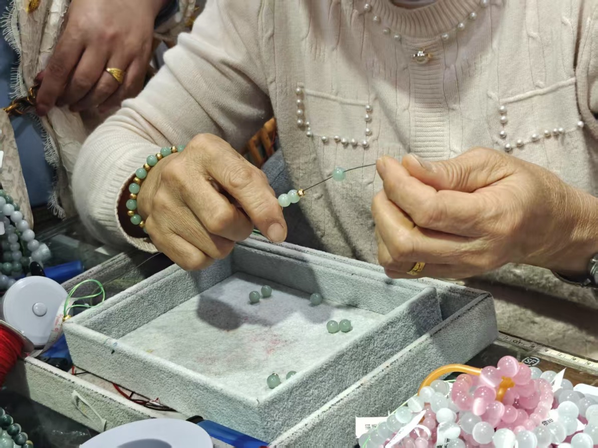 黄金市场一角,一位阿姨正在编织手链曾思怡/摄