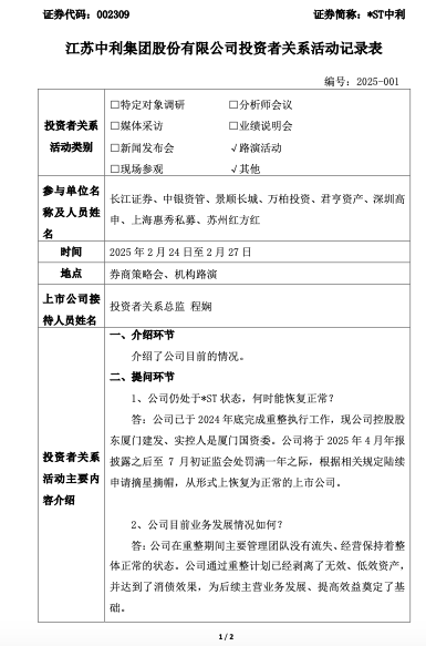 3月1日,江苏中利集团股份有限公司(以下简称“*ST中利”或“公司”)发布公告称,公司于2月24日至2月27日召开了券商策略会、机构路演。在活动中,*ST中利透露,公司将于2025年4月年报披露之后至7月初证监会处罚满一年之际,根据相关规定陆续申请摘星摘帽,从形式上恢复为正常的上市公司。