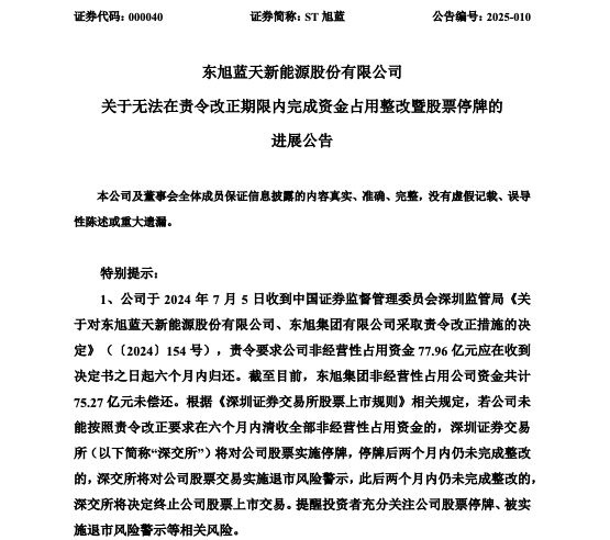 3月3日晚间,东旭蓝天新能源股份有限公司(以下简称“ST旭蓝”或“公司”)关于无法在责令改正期限内完成资金占用整改暨股票停牌的进展公告。公告称,截至目前,东旭集团非经营性占用公司资金共计75.27亿元仍未偿还。清收未有实质性进展,公司未能在整改期限届满前完成全部整改。