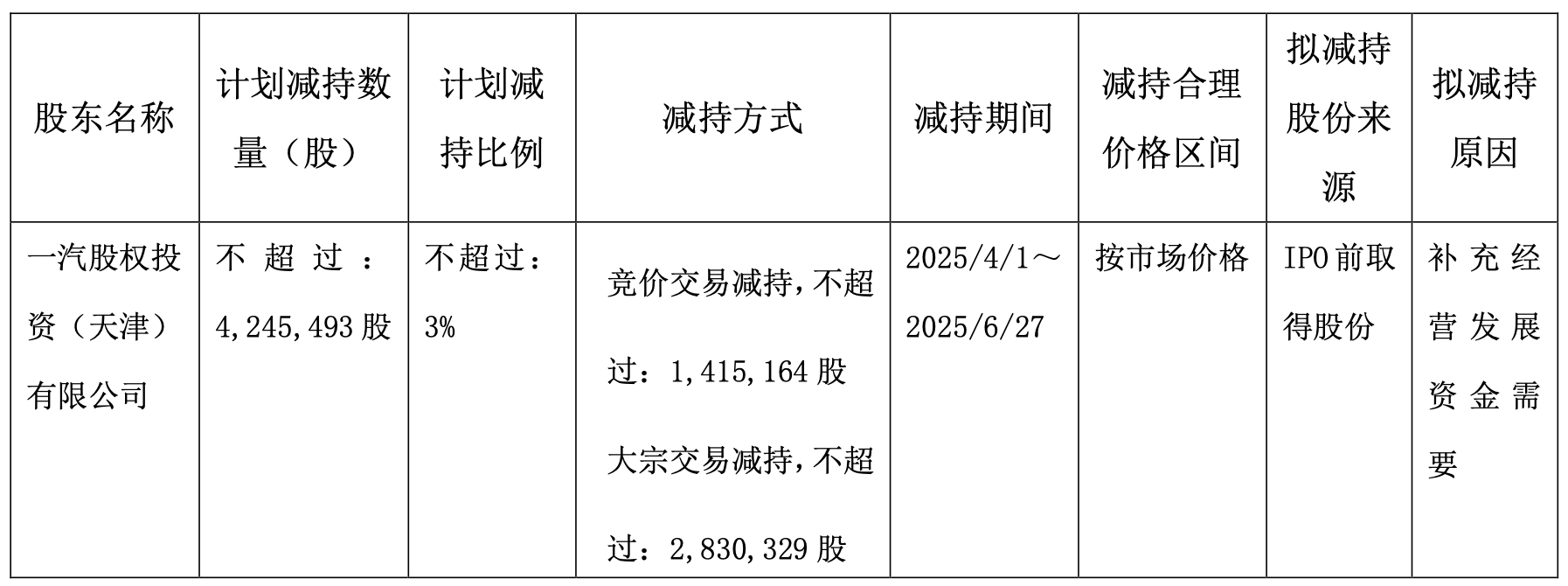 3月9日晚,长春一东(600148)公告,一汽股权公司拟通过集中竞价交易和大宗交易方式减持公司股份合计不超过424.55万股,即不超过公司总股本的3%。