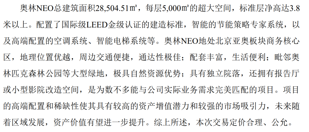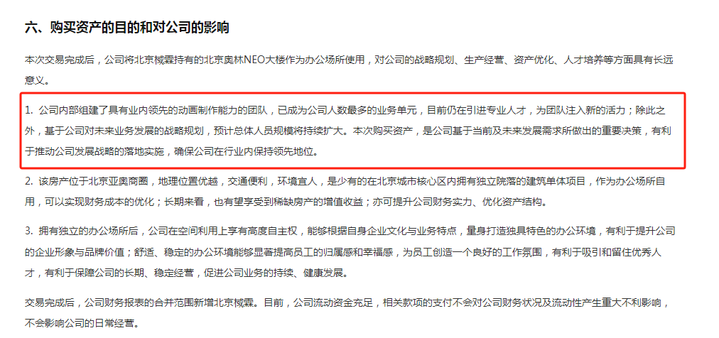 光线传媒表示,本次交易完成后,公司将北京棫霖持有的北京奥林NEO大楼作为办公场所使用,对公司的战略规划、生产经营、资产优化、人才培养等方面具有长远意义。