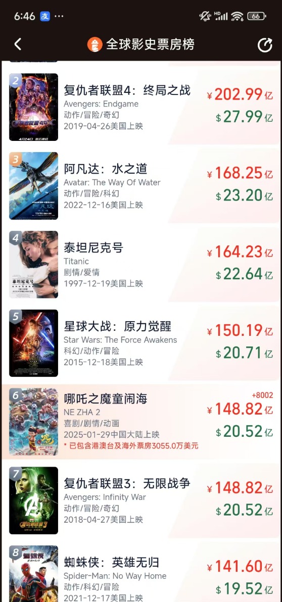 截至3月9日18时许,《哪吒2》全球票房(含预售及海外)超越《复仇者联盟3:无限战争》,冲入全球票房榜前六名。