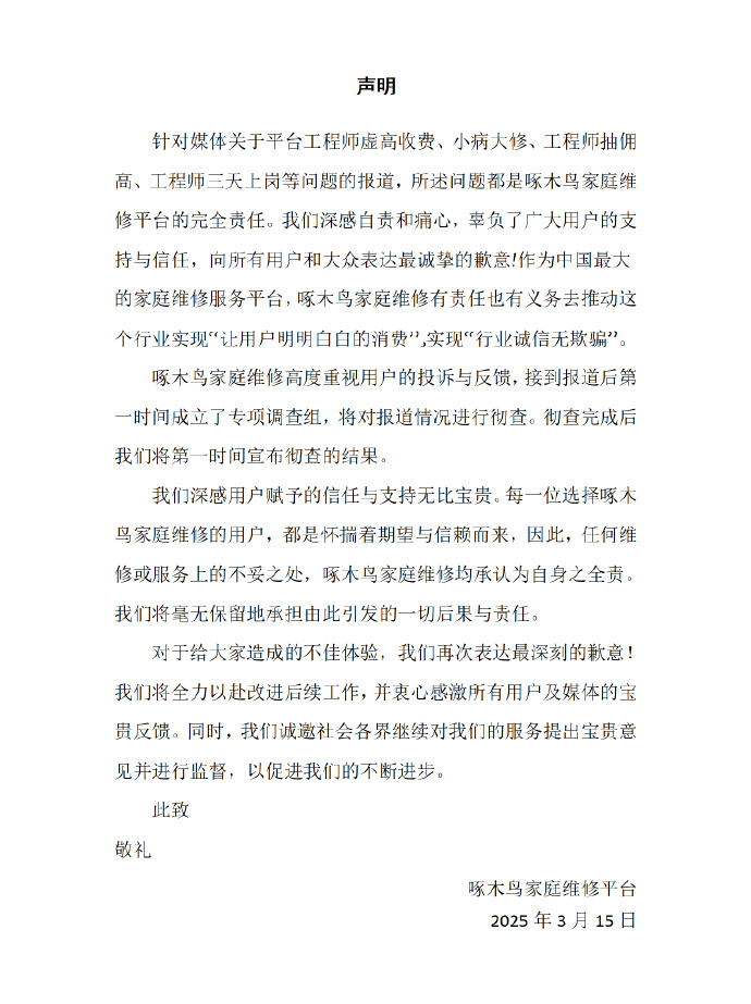 对此,啄木鸟家庭维修发布声明:针对媒体关于平台工程师虚高收费、小病大修、工程师抽佣高、工程师三天上岗等问题的报道,所述问题都是啄木鸟家庭维修平台的完全责任,公司深感自责和痛心。接到报道后第一时间成立了专项调查组,将对报道情况进行彻查。彻查完成后将宣布彻查的结果。
