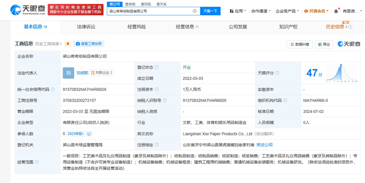 天眼查App显示,梁山希希纸制品有限公司成立于2022年3月,法定代表人为刘成乾,注册资本1万人民币,经营范围包括纸制品制造、纸制品销售、纸浆制造、纸浆销售、工艺美术品及礼仪用品销售等,由刘成乾全资持股。变更记录显示,2024年7月,该公司注册资本由100万人民币减至1万人民币。