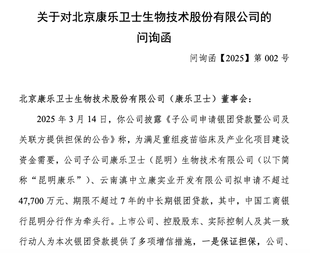 2025年3月14日,康乐卫士披露《子公司申请银团贷款暨公司及关联方提供担保的公告》称,为满足重组疫苗临床及产业化项目建设资金需要,公司子公司康乐卫士(昆明)生物技术有限公司(以下简称“昆明康乐”)、云南滇中立康实业开发有限公司拟申请不超过4.77亿元、期限不超过7年的中长期银团贷款。上市公司、控股股东、实际控制人及其一致行动人为本次银团贷款提供了多项增信措施,一是保证担保,公司、控股股东天狼星控股集团有限公司、实际控制人陶涛及其一致行动人为此次贷款提供全额连带责任保证;二是抵押担保,子公司重组疫苗临床及产业化基地(一期)项目土地使用权、地上在建工程及机器设备将作为此次贷款的抵押物;三是质押担保,公司所持有HPV疫苗相关专利权以及所持子公司昆明康乐的全部股权将作为此次贷款质押物。同时,控股股东持有公司75%股票、实际控制人一致行动人北京江林威华生物技术有限公司持有公司全部股票(合计占公司总股本24.46%)也将被质押。