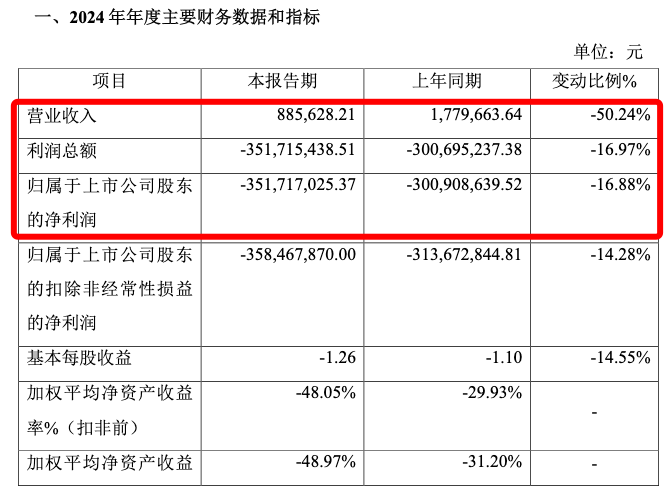 据2024年业绩快报,公司全年实现营业收入88.56万元,同比下降50.24%;归母净利润亏损3.52亿元,上年同期亏损3.01亿元,同比下降16.88%;扣非净利润亏损3.58亿元,上年同期亏损3.14亿元,同比下降14.28%。