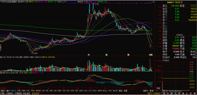 因财务造假而连续10个交易日触及跌停的东方集团(600811)在停牌一天后,周二(3月18日)以*ST东方的简称复牌。但不出意料该股复牌后一字跌停于0.87元。