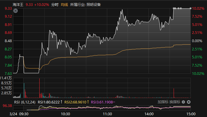 海洋王今日早盘一度跌停,盘中震荡拉升,下午2:36涨停,上演“地天板”走势。截至收盘,该股报9.33元/股,涨停板上封单约4万手。至此,近8个交易日,该股已收获6个涨停板。