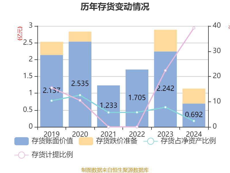 从存货变动来看,截至2024年末,公司存货账面价值为6916.74万元,占净资产的2.33%,较上年末减少1.55亿元。其中,存货跌价准备为4458.23万元,计提比例为39.19%。