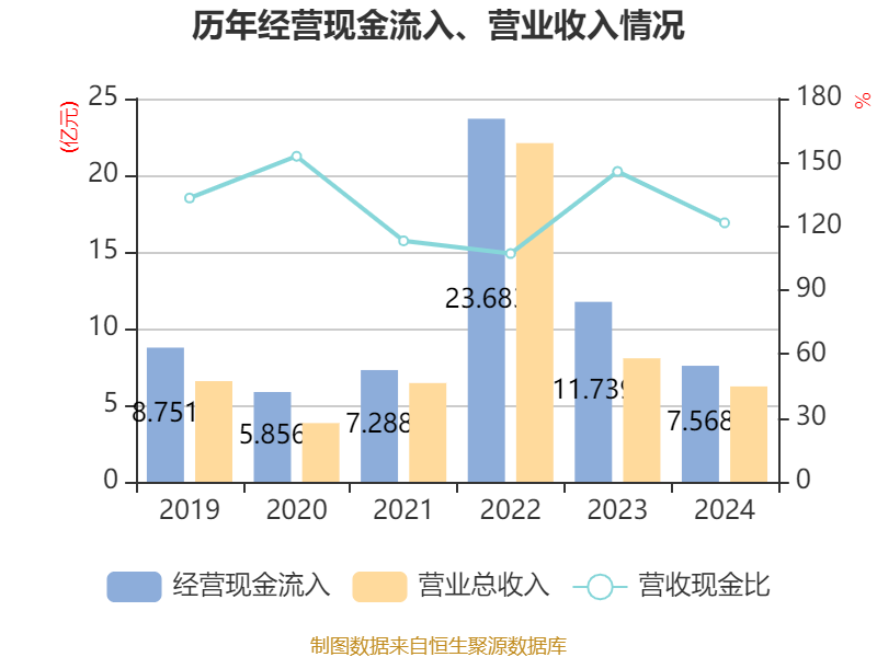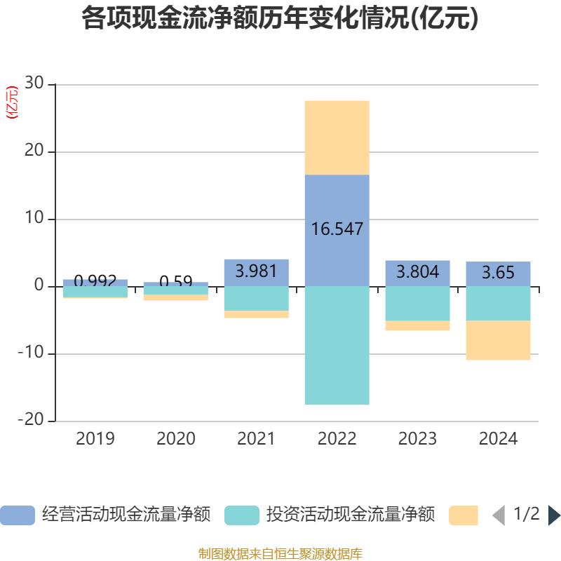 截至2024年,公司经营活动现金流净额为3.65亿元,同比下降4.05%;筹资活动现金流净额-5.83亿元,同比减少4.4亿元;投资活动现金流净额-5.17亿元,上年同期为-5.18亿元。