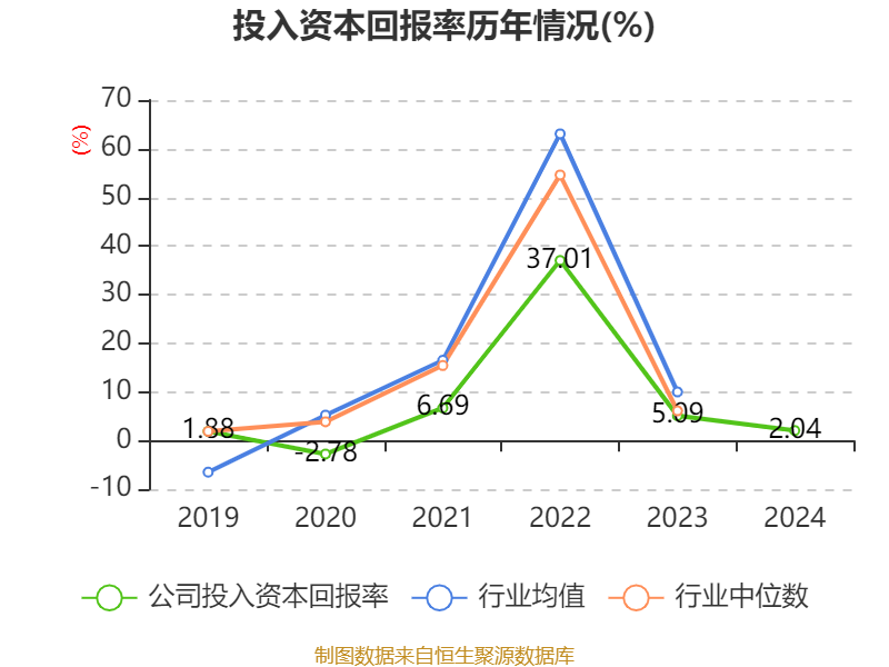 数据显示,2024年公司加权平均净资产收益率为3.83%,较上年同期下降1.58个百分点。公司2024年投入资本回报率为2.04%,较上年同期下降3.05个百分点。