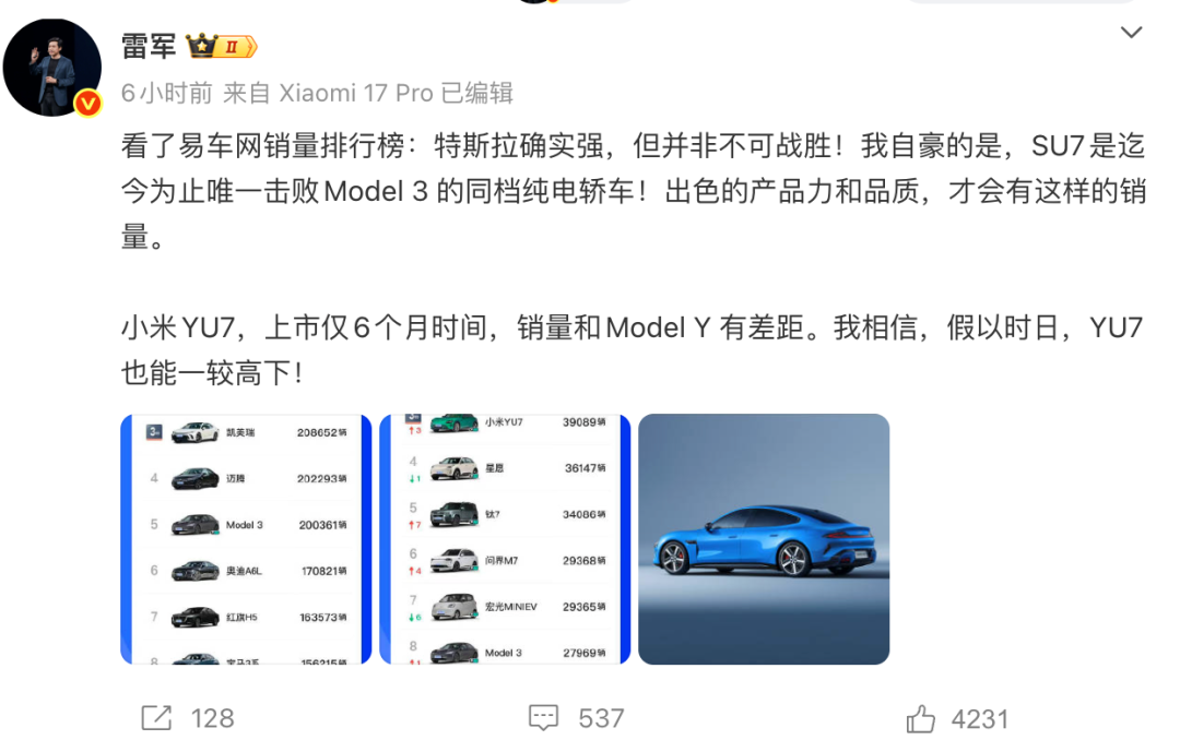 1月10日,小米创始人、董事长兼CEO雷军在微博发文称:“特斯拉确实强,但并非不可战胜!”雷军表示,看了易车网销量排行榜,令他自豪的是,SU7是迄今为止唯一击败Model 3的同档纯电轿车。“小米YU7,上市仅6个月时间,销量和Model Y有差距。我相信,假以时日,YU7也能一较高下! ”