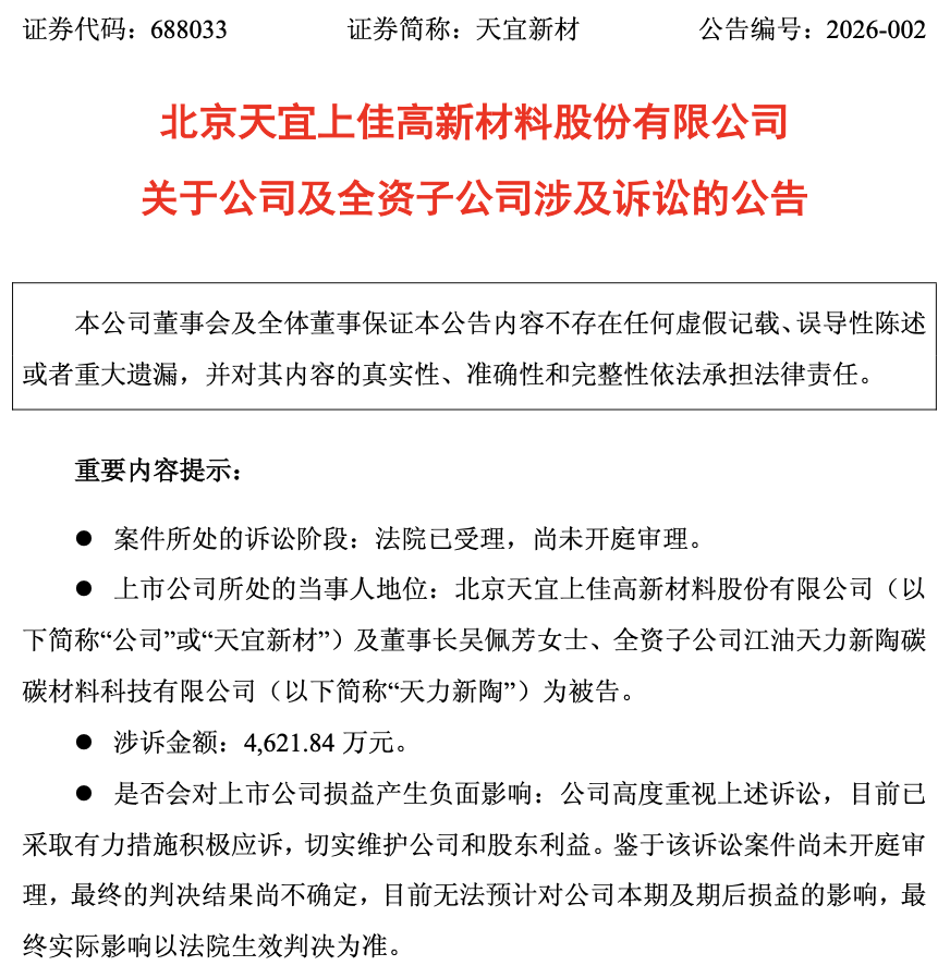 天宜新材表示,公司高度重视上述诉讼,目前已采取有力措施积极应诉,鉴于该诉讼案件尚未开庭审理,最终的判决结果尚不确定,目前无法预计对公司本期及期后损益的影响,最终实际影响以法院生效判决为准。公司不存在应披露而未披露的其他诉讼、仲裁事项。